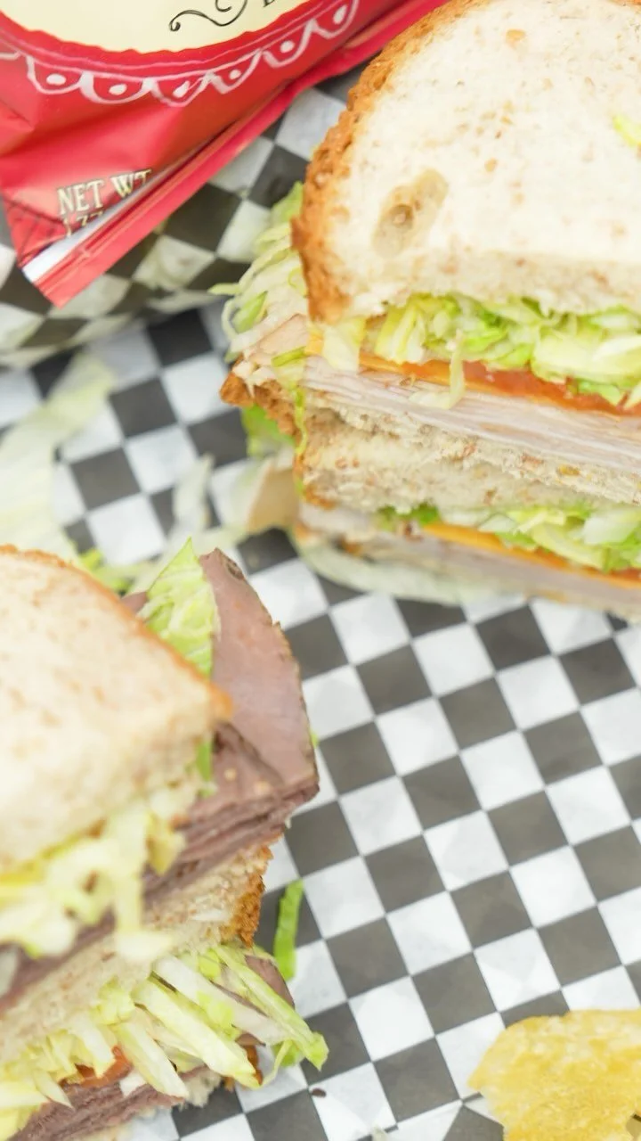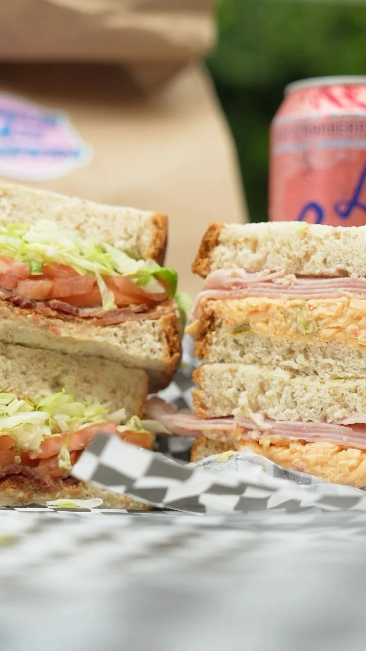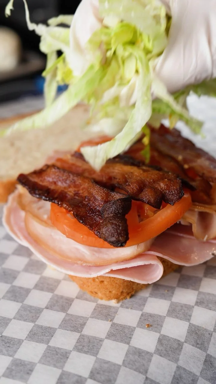 Traditional club sandwich with smoked turkey, hormel pit smoked ham, hardwood smoked bacon, iceberg lettuce, and pickled tomato. Choose a Sauce.